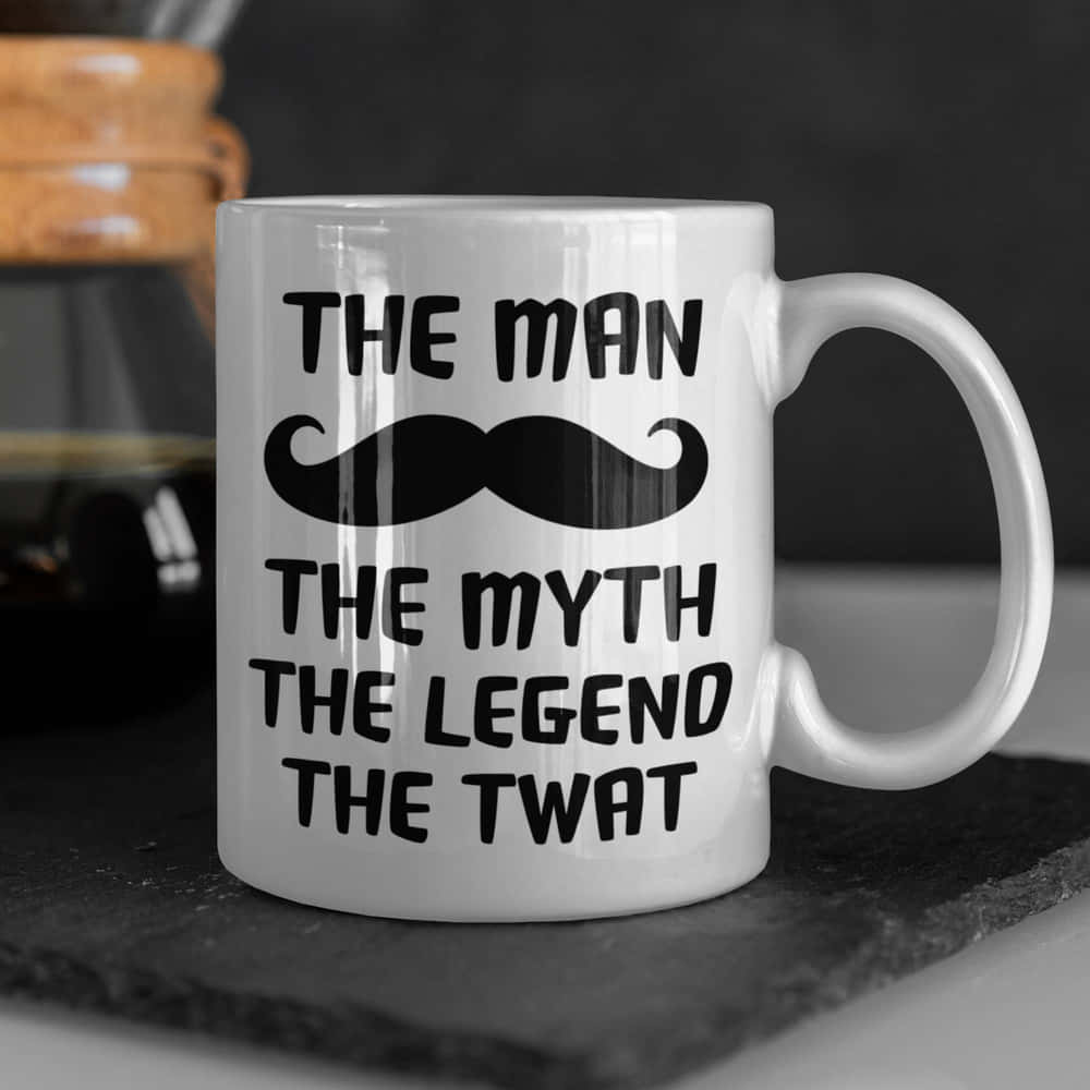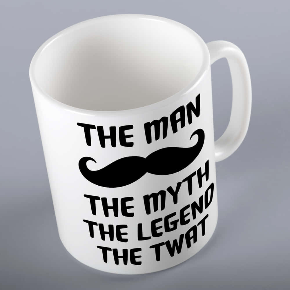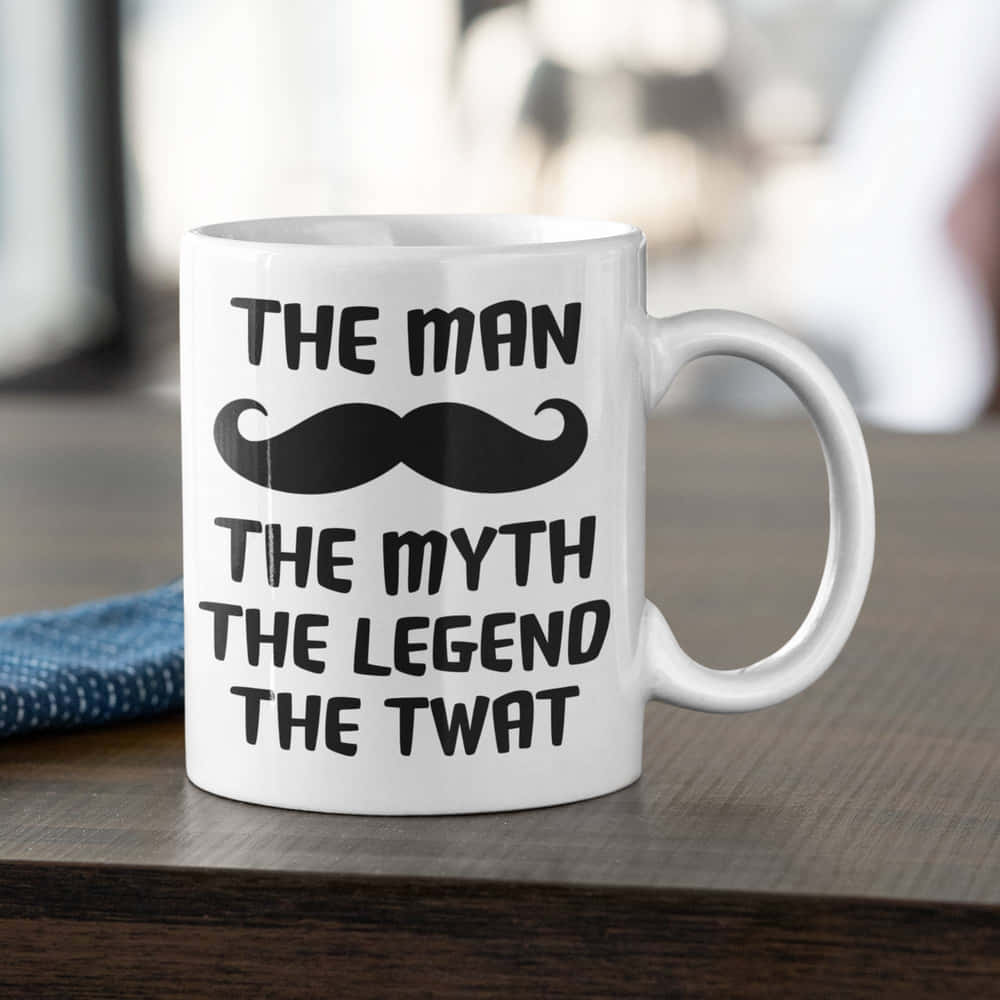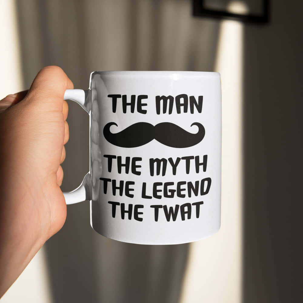 This The Man The Myth The Legend Mug 10oz Coated Ceramic Ultra White Mug features the quote The Man, The Myth, The Legend, The Twat, along with the an image of a moustache.